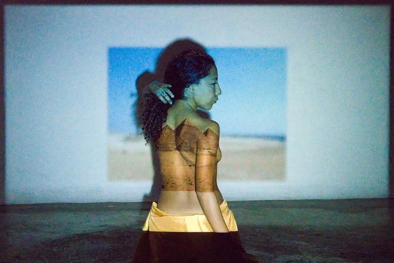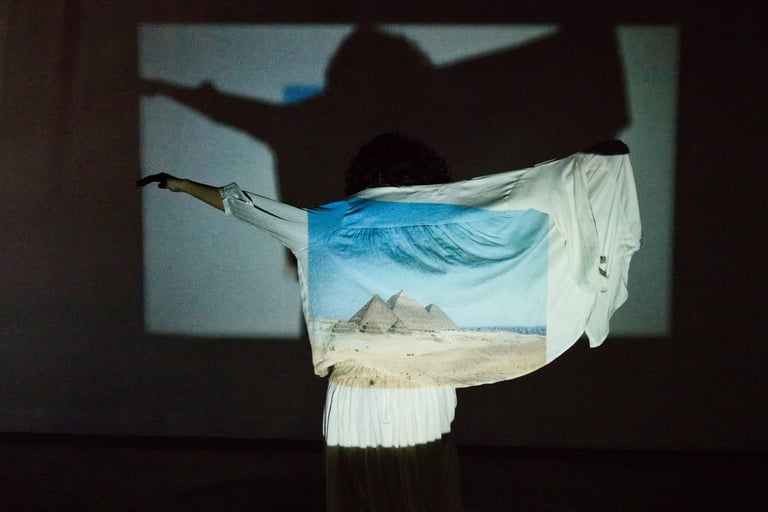 Todo viaje se impregna en la piel de que lleva el cuerpo a sentir otros lugares. Egipto es un proyecto documental artístico que combina el retrato y la fotografía de viaje. La modelo hizo un viaje a Egipto, tomó fotografías de paisajes y geometrías arquitectónicas que llamaban su atención y colectó te, plumas, arena, piedras y fósiles. El proyecto consistió en dos sesiones, una con modelo y proyector y otra con fotografía macro y flash speedlite.