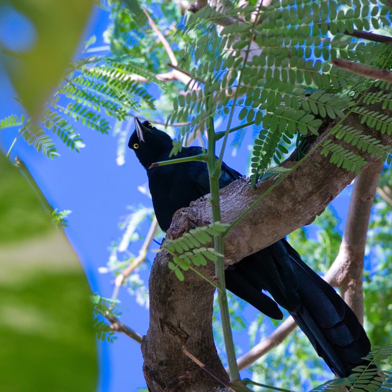 Caminando sobre la carretera que llega al aeropuerto de Cancún descubrí algo: las plumas de un zanate macho que recientemente había muerto no eran negras, sino azules. La revelación me pareció brutal. ¿Cómo un ave (con sus plumas azules, pero también negras y ojos color de sol) es un cielo de colores que cruza el cielo? Las hembras, en cambio, son del color de la tierra. Y ambos se comportan tan humanos, que podrían ser ellos quienes me fotografían con los ojos. Los zanates siempre están cerca y se dejan ver, excepto a través de la cámara. Se van. Son aves de carácter fascinante.